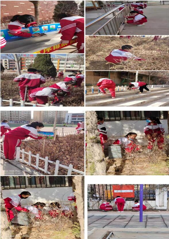 师生们精神饱满,积极参与,不怕脏,不怕累,团结协作,分工具体。擦洗校园围栏展板、捡拾花坛树丛中的垃圾,校园随处可见同学们热火朝天辛勤劳动的身影 !