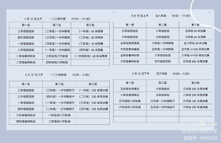 为认真贯彻落实《灵武市中学生运动会暨第三届小学生趣味运动会规程》和《学校体育工作条例》的规定,全面实施素质教育,积极促进体育与健康教学和课余训练,提高全校学生体育竞技水平和学校体育工作水平,推动“阳光体育运动、每天锻炼一小时”深入开展,灵武市第四小学于2022年5月12日正式举办“灵武市第四小学2022年春季趣味运动会”。