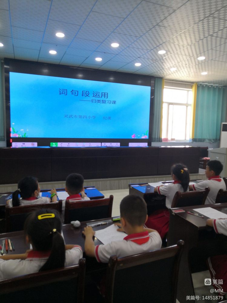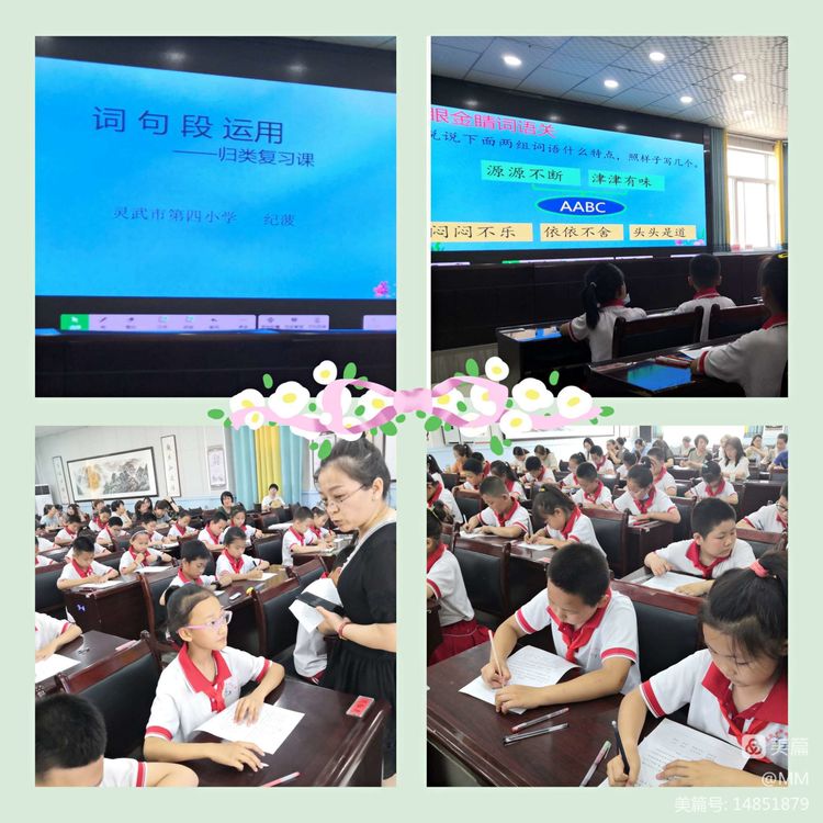 活动分为两部分,第一部分,灵武市第四小学纪菠老师的复习示范课《词句段运用——归类复习法》,纪老师带着同学们“闯三关”,采用讲练结合的方法,用例题引导学生梳理并总结各种词、句、段题型的解题方法,再巧用方法突破重难点。