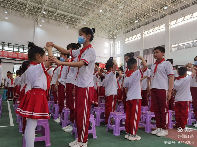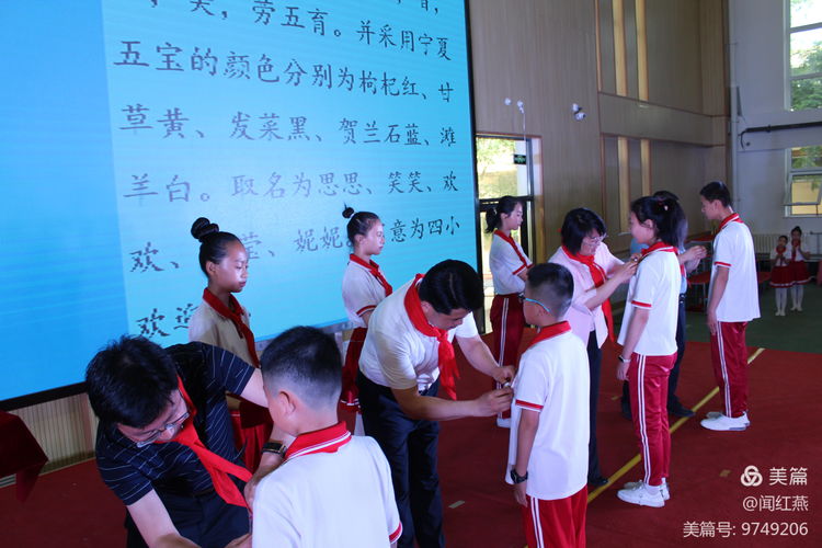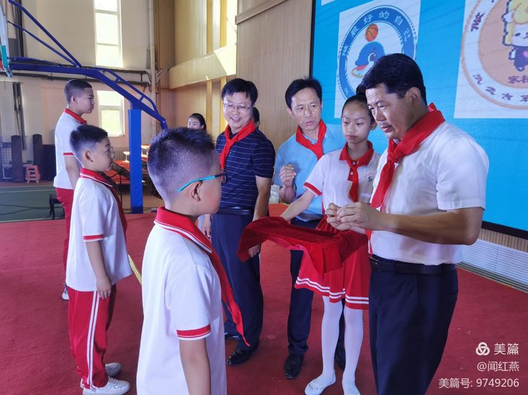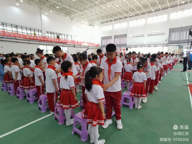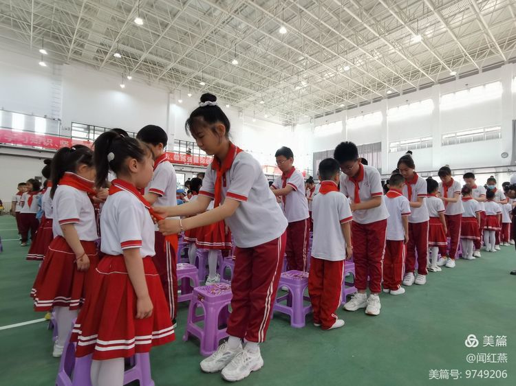 随后,高年级的优秀少先队员代表为新队员授、系红领巾,示范行标准少先队礼,并为新队员送上寄语。告诉他们:红领巾是国旗的一角 ,是用革命先烈鲜血染红的。今后学习生活中当用实践行动去传承红色精神,完成肩上的使命。