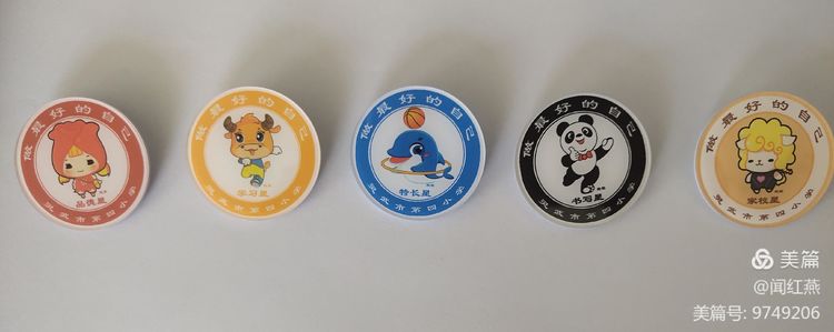 我校红领巾争章为品德星,学习星,书写星,特长星,家校星五星,分别融入德,智,体,美,劳五育。并采用宁夏五宝的颜色分别为枸杞红,甘草黄,贺兰石蓝,滩羊白,发菜黑。取名为思思,笑笑,欢欢,莹莹,妮妮。寓意为四小欢迎您。