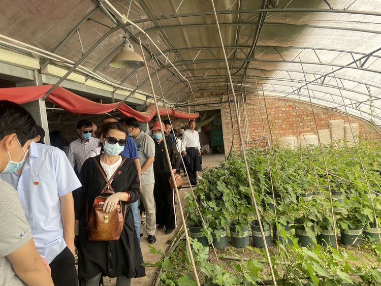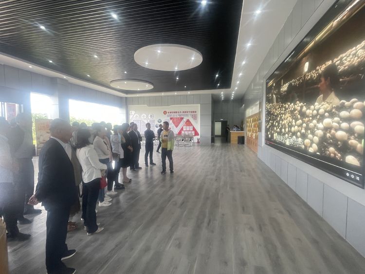 在闽宁镇讲解员的引导下,我们来到原隆村闽宁禾美电商扶贫车间。在这里,我们了解了“村党支部+扶贫车间+贫困户”脱贫模式,以及“闽宁巧媳妇”直播带货团等脱贫创新模式,从依靠“输血”到自己“造血”。来到昌盛光伏生态科技园,党员教师进一步了解了闽宁光伏农业大力发展瓜果蔬菜种植、苗木培育、中草药种植和高端菌菇生产等扶贫产业项目。