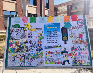 瞧,孩子们的安全标识做好了!校园展板上贴满了孩子们精心制作的标志。