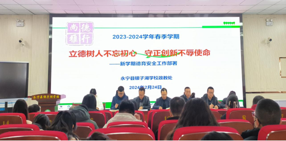 春回万物生,策马踏征程。春光为序,共启新篇。教育之本在于立德树人,班主任是学校德育工作的重要执行者,更是学生健康成长的引路人。为全面增强班主任德育意识,推动和促进班主任队伍的建设,切实提高班级管理的有效性,为本学期开学做好充分准备,使开学工作井然有序,2024年2月24日上午银子湖学校召开了2023-2024学年第二学期春季德育安全工作暨班主任工作会议。