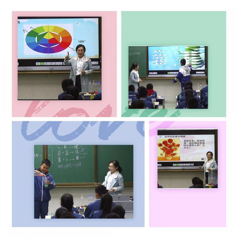 例如,案例二中对湘版美术七年级上册第三课《画家笔下的色彩》讲述的过程中,由于本次教学的主要目标是让学生了解色彩给人的感受、认识色彩并运用色彩会表达情感。在教学实践之前,教师先利用多媒体技术在所准备的希沃版课件中以美国航空创意短片《两个世界》视频进行导课,引出本节课的课程名称。色彩游戏环节:让学生根据右边的色彩属性把相对应的色彩感情联系起来,学生互动活跃了课堂气氛。在讲认识色彩时通过“色彩变变变”的小实验,让学生自己动手操作并加深对色彩的理解,这种实操性教学突破了常规美术课一板一眼的教学。在运用色彩表达情感观察色彩环节中:课件展示在不同背景音乐下的梵·高同一题材,不同色调的《向日葵》图片让学生体会当时画家作画的心情,从而得到不同的色彩给人的感觉也是不同的。色彩的这一特性常被运用到艺术作品中,用它来营造气氛和传达情感。课堂最后通过手机端“移动讲台”让学生对自己的作业进行投屏并让学生自我评价。评价的目的:鼓励学生个性思考的发展,激励他们,让他们感觉到成功的机会和希望。通过在色彩、笔触上体会到国内外优秀美术品的丰富精神内涵,从而达成教学目标。