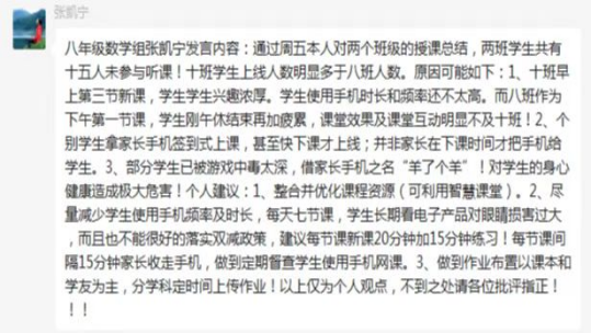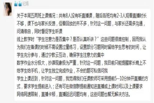 组内教师依次就自己在线上教学过程中遇到的问题、困难,以及进行线上教学时摸索出来的有效做法及经验进行交流、讨论。为了便于大家借鉴学习,我们又以文字的形式发在群里共享。